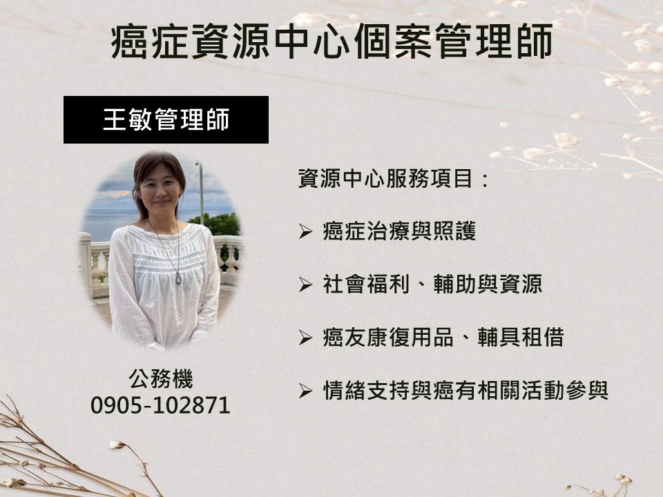 整合醫院與社區各項資源,提供所需的各項資源諮詢與服務,讓癌症病人或家屬能迅速獲得所需資訊,使其在罹癌的重大衝擊後,不僅可及早接受正規治療,並於治療後順利重返社區,儘快恢復生活步調及尊嚴地掌控自我。