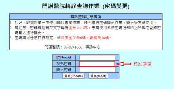 輸入①醫事機構代碼②密碼;若為首次登入請依核准密碼登入後,更新密碼(長度至少為6碼,最長為10碼)