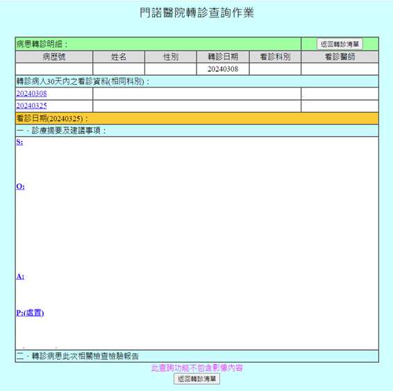 2.點選轉診日期:就會顯示門診紀錄,及相關的檢驗檢查報告、轉診病人30天內之看診資料(相同科別)。
