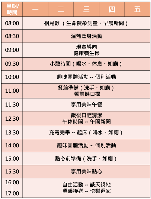 - 內容包含:生活照顧、健康促進、文康休閒活動、家屬指導及諮詢服務