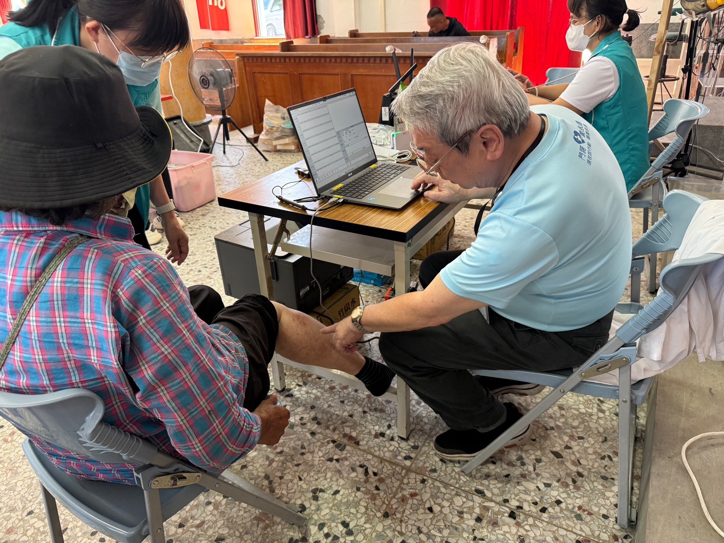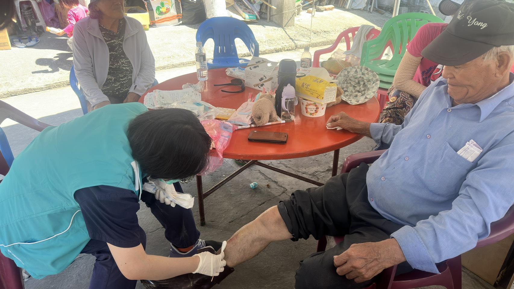 護理師揹著沉甸甸的醫療箱,踩著泥濘的道路,挨家挨戶敲門探望:「伯伯,今天傷口有沒有比較好?」「阿嬤,藥有沒有按時吃?」當發現有人腿上傷口需要換藥,他們就在家裡的門口或客廳,細心清理、重新包紮,還不忘輕聲提醒要多休息、記得吃藥。