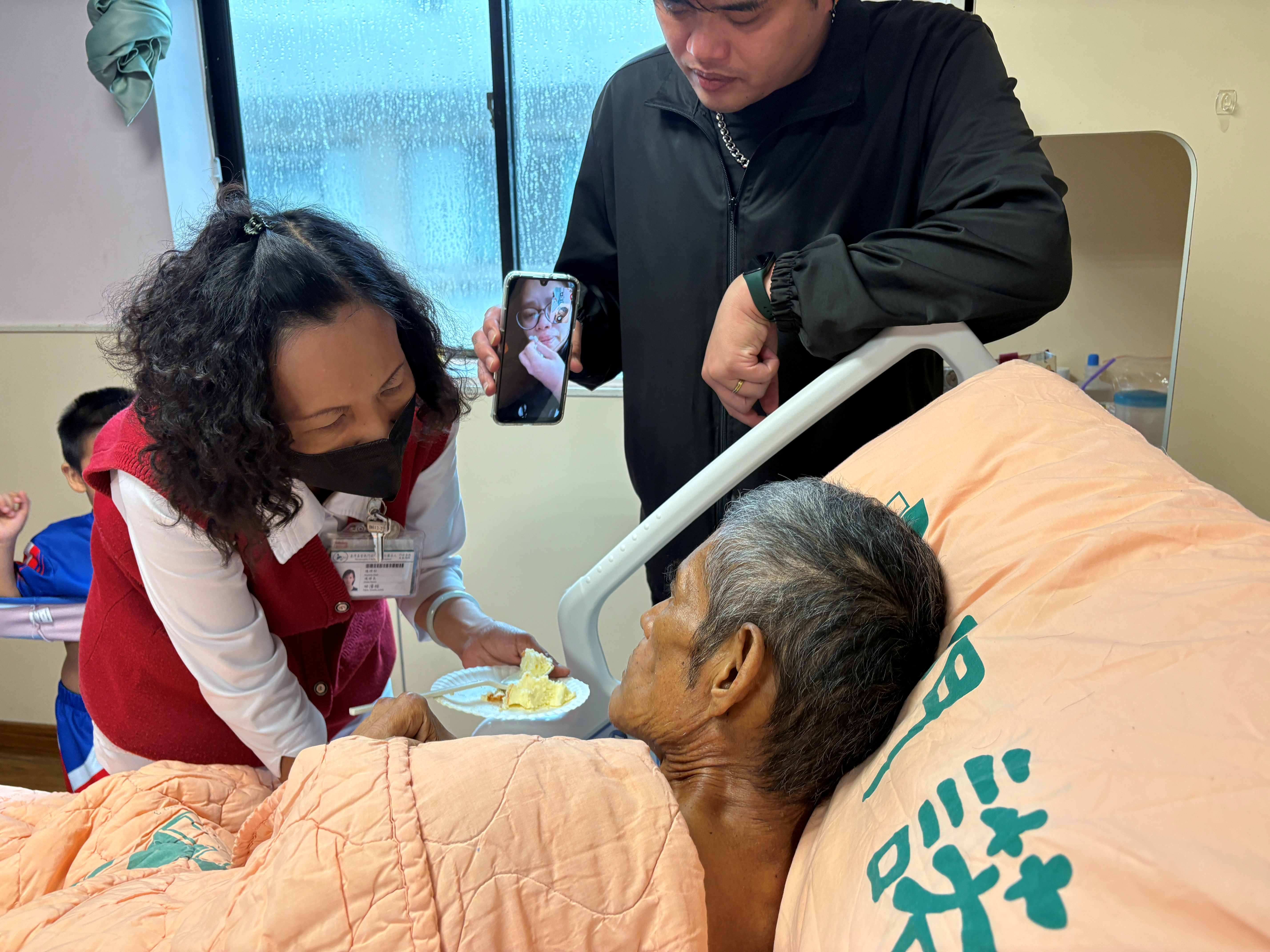 當子女和孫子以及醫護團隊聚在床邊唱起生日快樂歌,原本因無法返家而感到失落的任先生,竟也跟著打起拍子,哼著旋律,最後還開心地吃起蛋糕。那一口口蛋糕,他吃得特別香甜,就像回到了從前一家人團聚的日子。無法到場的女兒則抱著剛出生的外孫女透過視訊傳遞祝福,一家人的心緊緊連在一起。