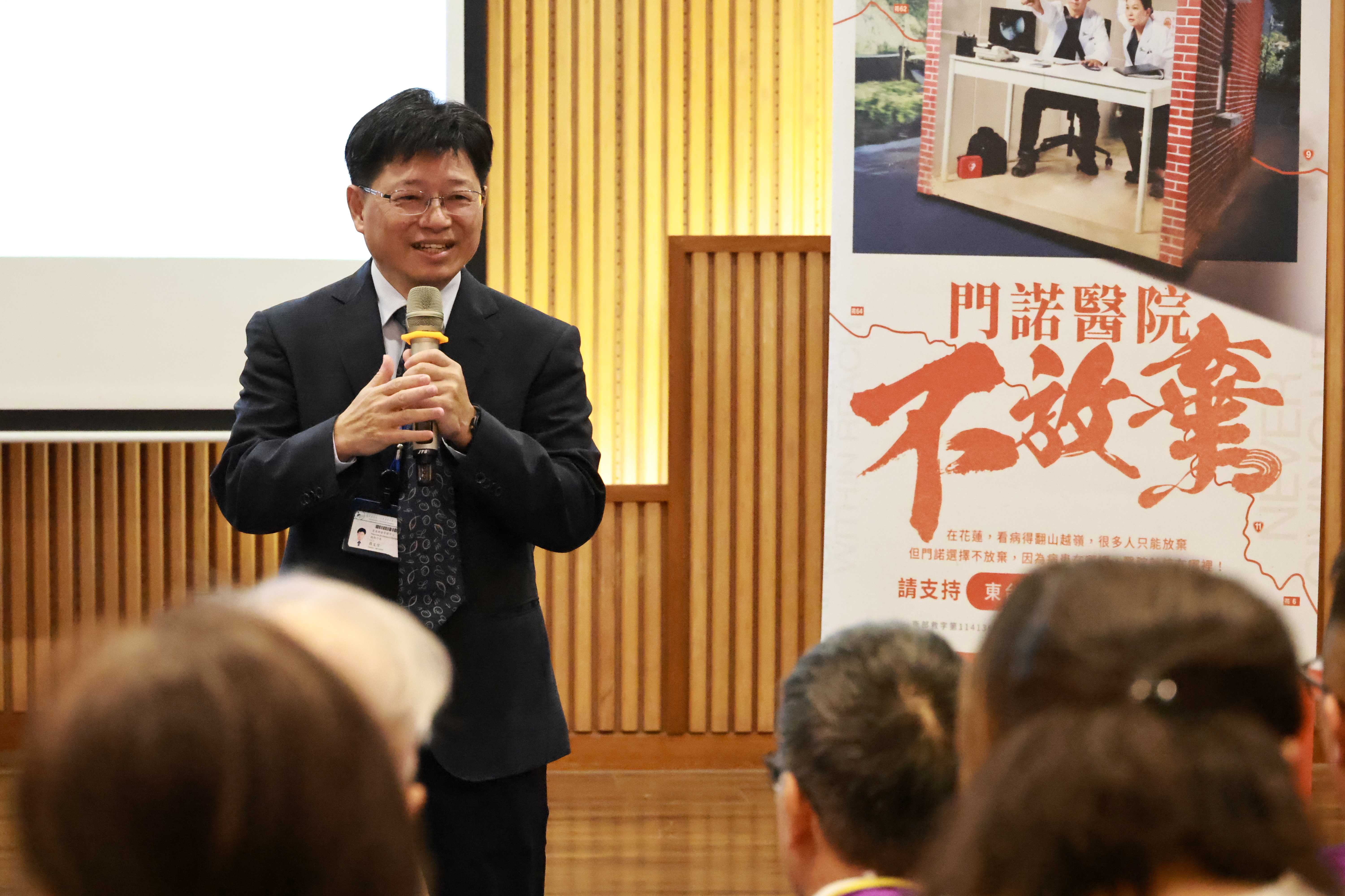 會場上播放了門諾醫院「不放棄」勸募專案的短片。影片中,醫師與治療師們翻山越嶺,走進卓溪、富里、秀林等山區部落,為失能長輩進行吞嚥檢查、為發展遲緩的孩子進行早療。影片結尾的一句旁白「真正的醫療不該只在醫院,而是病人所在的地方」引發全場掌聲。