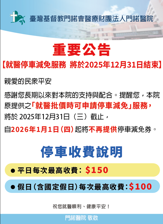 感謝您長期以來對本院的支持與配合。提醒您,本院原提供之「就醫批價時可申請停車減免」服務,將於2025年12月31日(星期三)截止,自2026年1月1日(星期四)起將不再提供停車減免券。