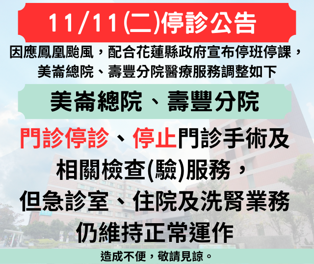 11/11(二)因應鳳凰颱風,花蓮縣政府宣布停班停課,美崙總院、 壽豐分院 醫療服務調整如下: