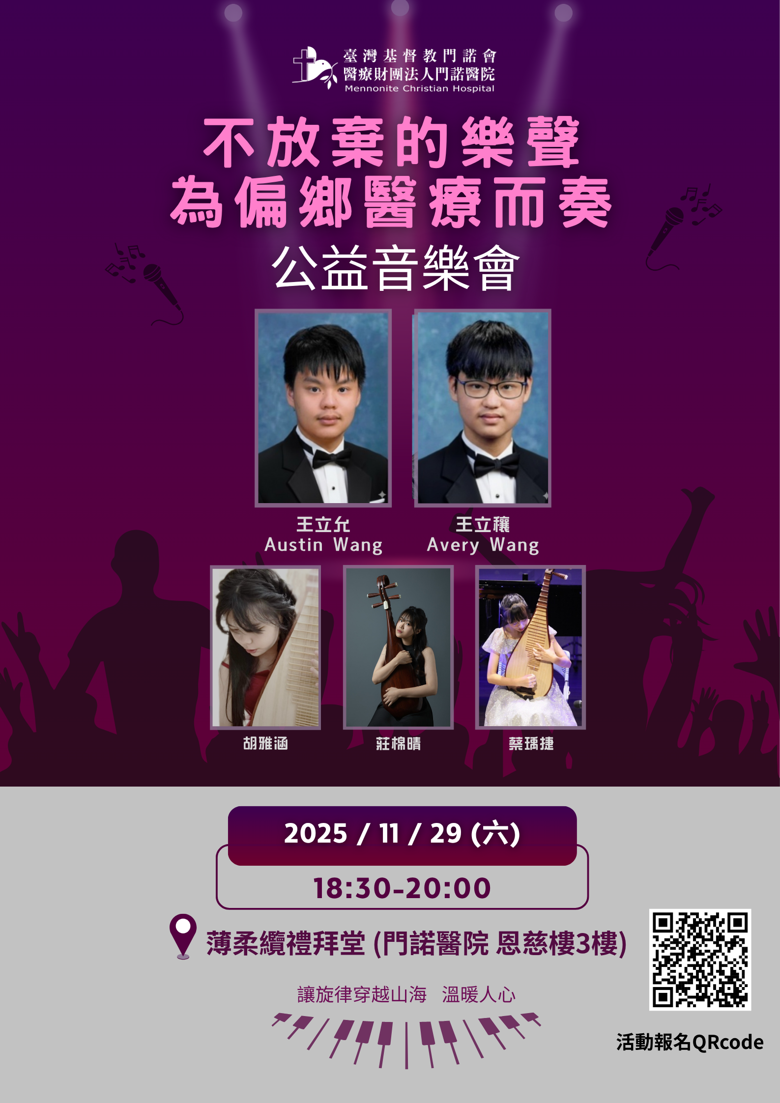 一年中最溫柔的季節來臨,我們誠摯邀請您在 11/29(六)18:30–20:00 走進 薄柔纜禮拜堂,參加 「不放棄的樂聲-為偏鄉醫療而奏」音樂會。