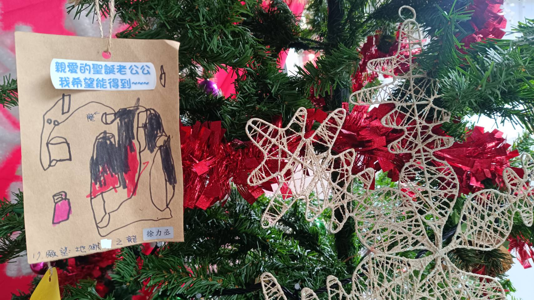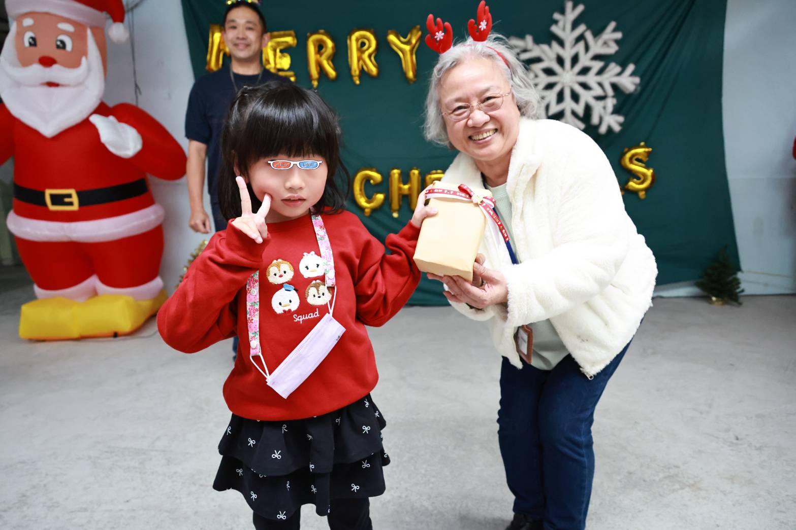 幼兒園瞬間變身童話場景。巨型充氣聖誕老人迎賓,金色「MERRY CHRISTMAS」氣球在空中閃耀,一棵掛滿孩子親筆寫下心願卡的聖誕樹,靜靜站在中央。孩子們戴著鹿角髮箍,圍著醫護人員又跳又叫,興奮得舉起小手揮舞,笑聲像煙火般接連綻放,把災後的陰影暫時拋到腦後。