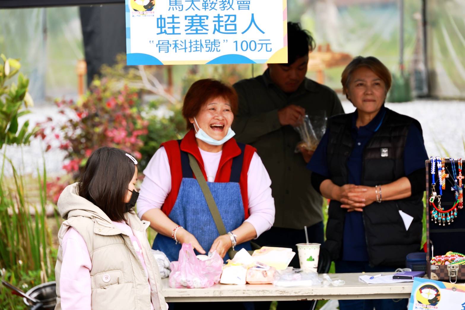 另一頭,「蛙賽風味餐」的攤位前笑聲不斷。郭金蘭長老,用幽默包住最驚險的記憶。她描述洪水來時的速度:「一秒到膝蓋,三秒到胸口。」夫妻倆在屋頂等待救援十幾個小時,家當全都被沖走。災後,有人建議她離開光復,但她選擇留下。她說:「這裡是家。」市集上,她推出名為「蛙塞超人」的料理,每碗100元,還笑稱是「掛號費」。「這是幫光復顧筋骨的。」顧的,不只是身體,更是整個地方的士氣。