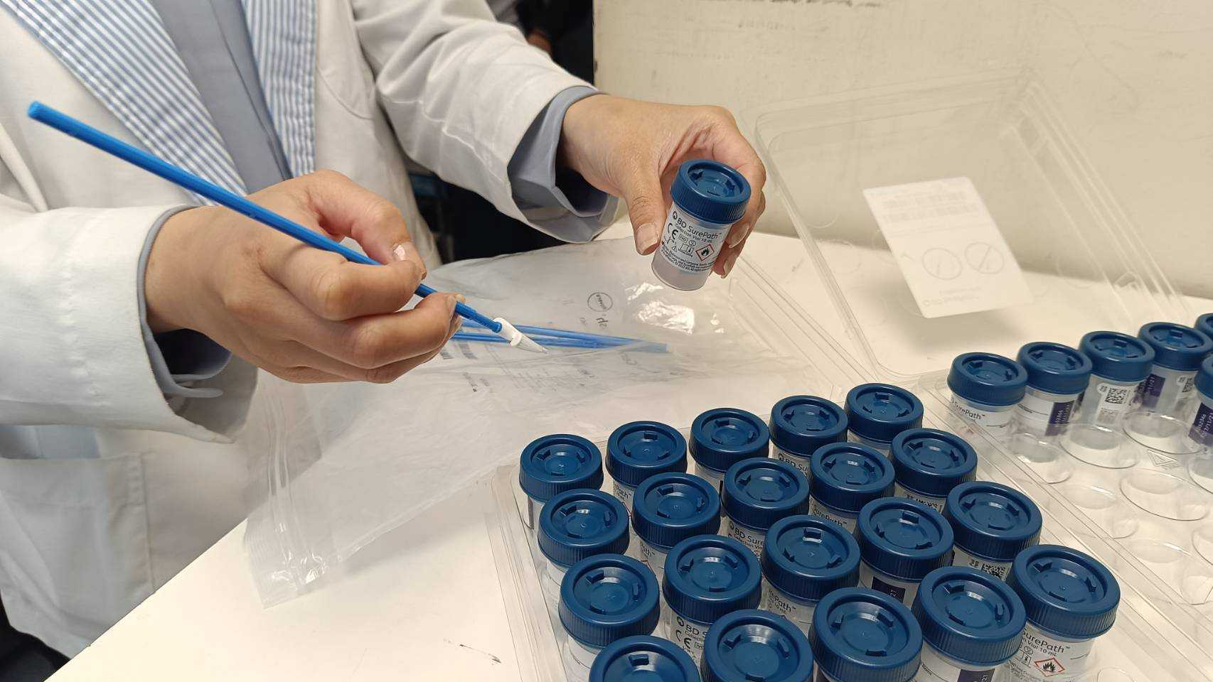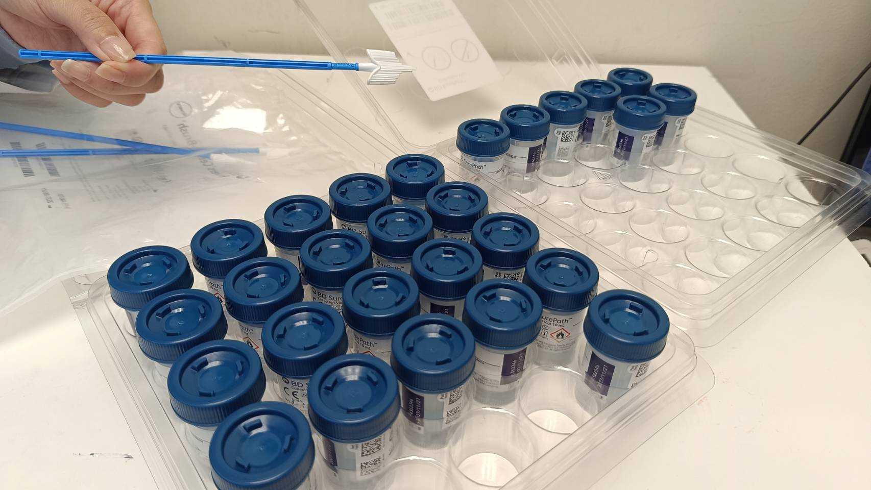 李靜婷指出,與傳統抹片相比,薄層抹片技術更具準確性與效率。傳統抹片需將採檢細胞塗抹於玻璃片上,過程中容易因塗抹不均或受到分泌物、血液污染,導致檢體品質不佳,甚至需重新採檢,不僅浪費時間,也增加心理壓力。相較之下,薄層抹片是將整支採檢刷直接置入保存液中送檢,經儀器過濾雜質並進行染色與判讀,能完整保留細胞結構,使影像更清晰、判讀更精準,「過去因檢體品質不佳而需要重做的比例,大幅下降,幾乎不用再重複採檢。」