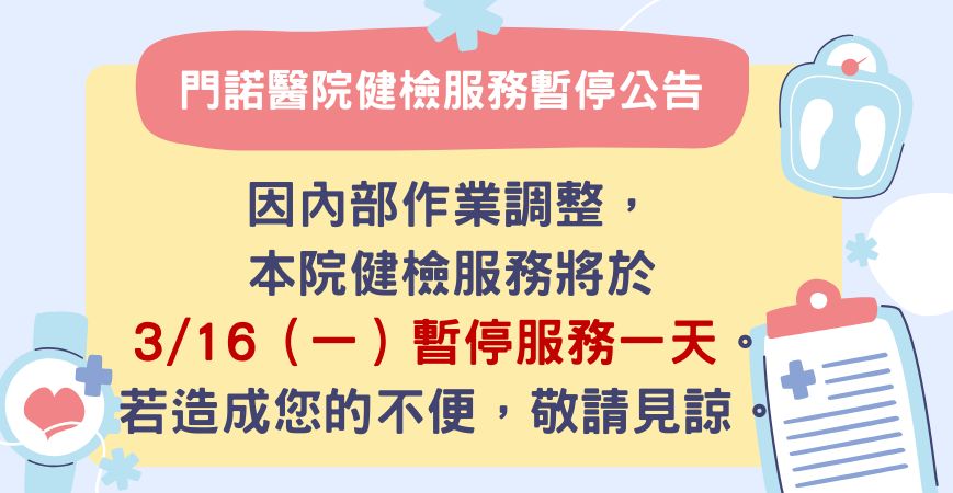 因內部作業調整,本院健檢服務將於 3月16日(星期一)暫停服務一天。若造成您的不便,敬請見諒。