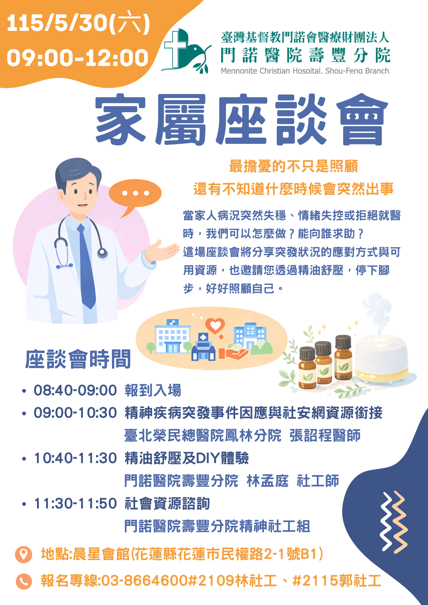 這場座談會將分享突發狀況的應對方式與可用資源,也邀請您透過精油舒壓,停下腳步,好好照顧自己。