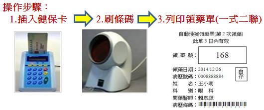 之慢性連續處方箋二、三次領藥,只要透過「插卡、刷條碼、領藥單」,三個步驟,全程不到一分鐘,即可至藥局等候領藥,省時又便利。歡迎民眾善加利用!
